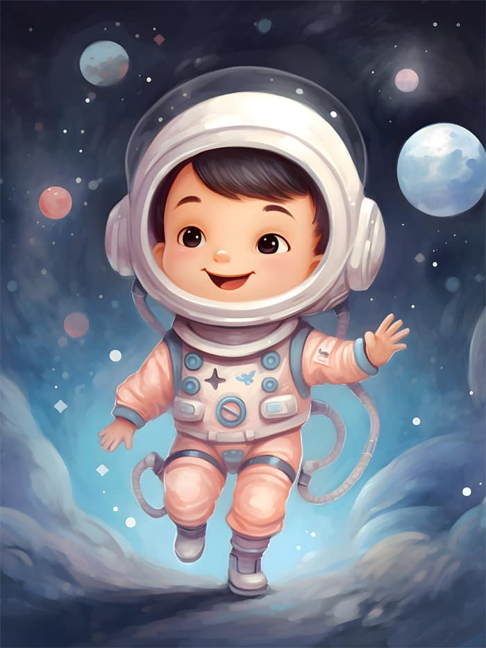 barnastronaut, rymdäventyr, drömmar i rymden, barnrumsinredning, kosmisk glädje, pastellrymd, galaxlek, interstellär upptäcktsresa, sött i rymden, sagobild