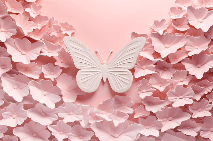Fjärilen och blommorna är skapade i 3D-stil med pappersliknande textur.