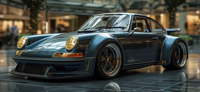 I ett glashölje av modern arkitektur vilar en klassisk Porsche – omritad i ljus. Den är mer än en bil: ett möte mellan historia och framtid, stilla men laddad, som en andhämtning i ett digitalt drömtillstånd.