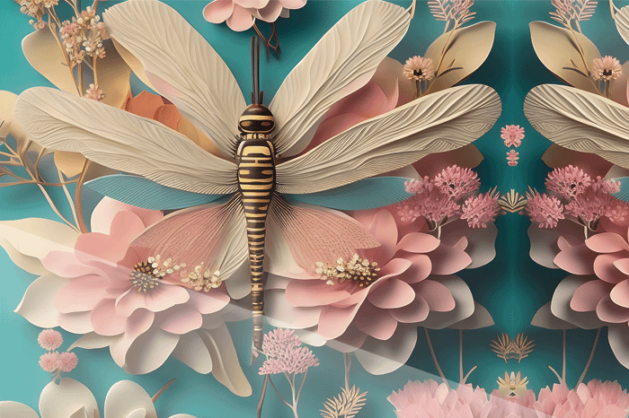 En förtrollande scen där en elegant trollslända vilar bland blommande pasteller på en djup turkos bakgrund. Den intrikata designen och färgerna i beige, rosa och korall skapar en känsla av lugn och naturlig magi – ett konstverk som väcker både nyfikenhet och beundran.