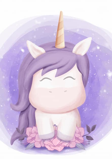 Mjuka toner i vitt, lavendel och puderrosa skapar en harmonisk helhet. Den lila bakgrunden glittrar som natthimlen, medan blommorna vid enhörningens fötter tillför en lekfull, sagolik känsla.