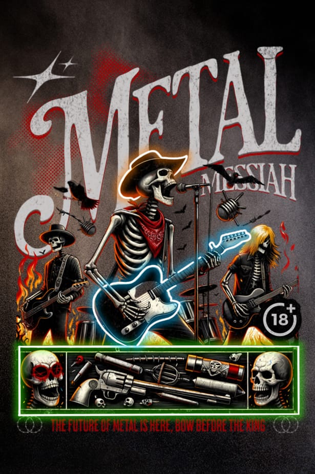 skelettrock, metalmessias, dystopisk western, neonvapen, helig distortion, kråkpsalm, helvetets konsert, undergångens soundtrack, odödlig riffkraft, framtiden är hård