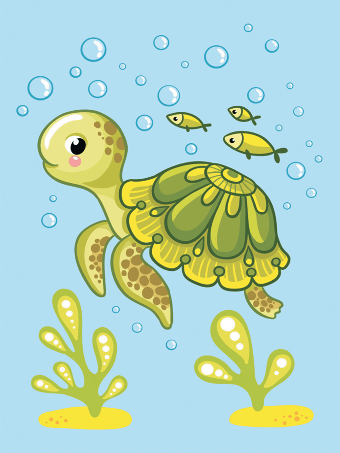 Sköldpaddans skal glänser i grönt och guldgult, och kroppen bär mjuka bruna fläckar. Runtomkring simmar små fiskar bland bubblor och grönskimrande sjögräs mot en ljusblå bakgrund.