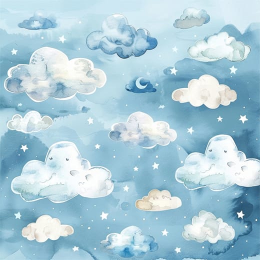 En förtrollad natthimmel där små, vänliga moln svävar i tyst harmoni. Två av dem lyser upp med neon – ett i blått och ett i grönt – som små stjärnväsen bland de andra akvarellmolnen. En måne och dussintals glimrande stjärnor ramar in scenen, som en vaggsång i bildform.