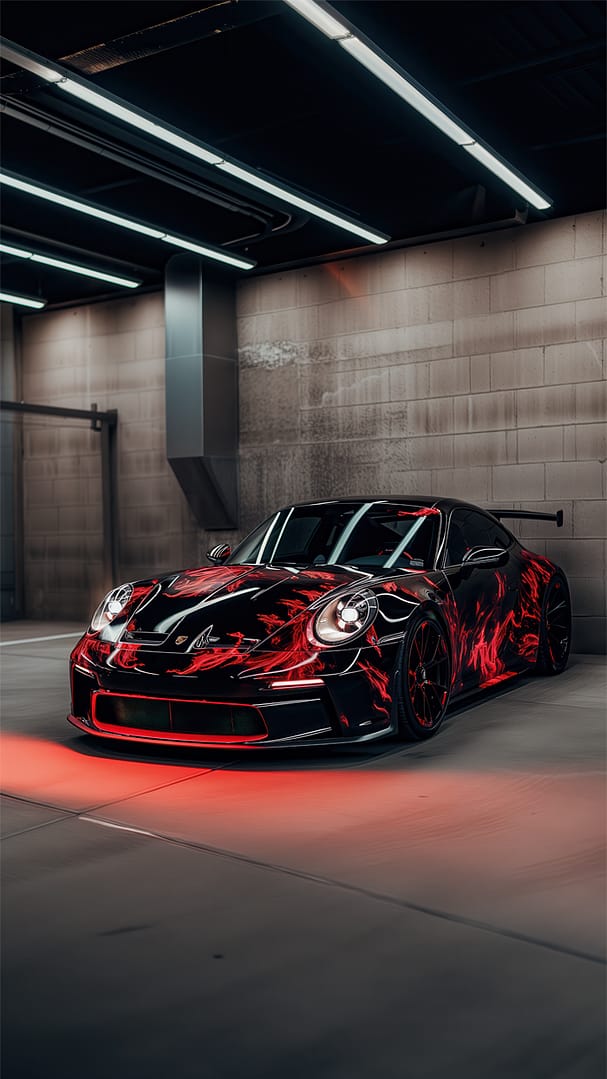 Den spegelblanka svarta lacken fångar rummets industriella gråskalor. Rödflammiga mönster pulserar som blodådror över karossen, medan grönt och blått neon bryter mörkret med kirurgisk klarhet.