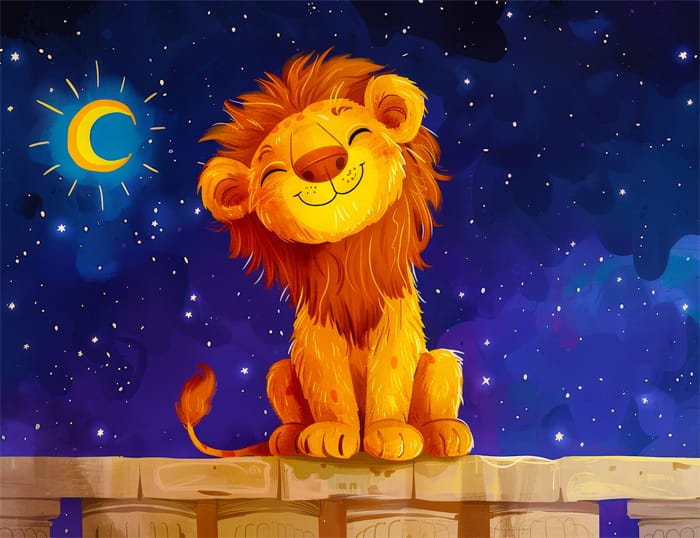 En gosig liten lejonunge sitter på en mur och blickar mot himlen med ett stort leende. Ovanför gnistrar stjärnorna och en lysande måne vakar över honom. En bild som förmedlar trygghet, lugn och mod – perfekt till barnrummet!