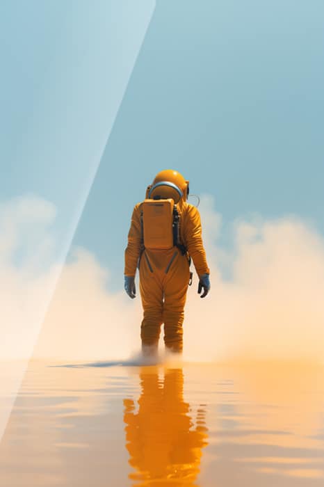 En fängslande bild av en ensam astronaut som vandrar över en reflekterande yta, omgiven av ett mystiskt ljus och dimma. En symbol för upptäckt och äventyr i en annan värld.