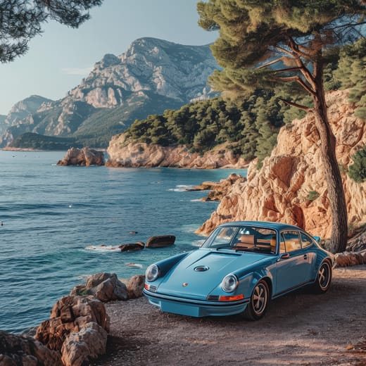 En blå vintage sportbil med glödande neonlinjer står parkerad längs en dramatisk kustlinje, omgiven av tallar, klippor och glittrande hav. Ett fängslande konstverk där retrobilens elegans möter naturens storslagenhet och futuristisk belysning.
