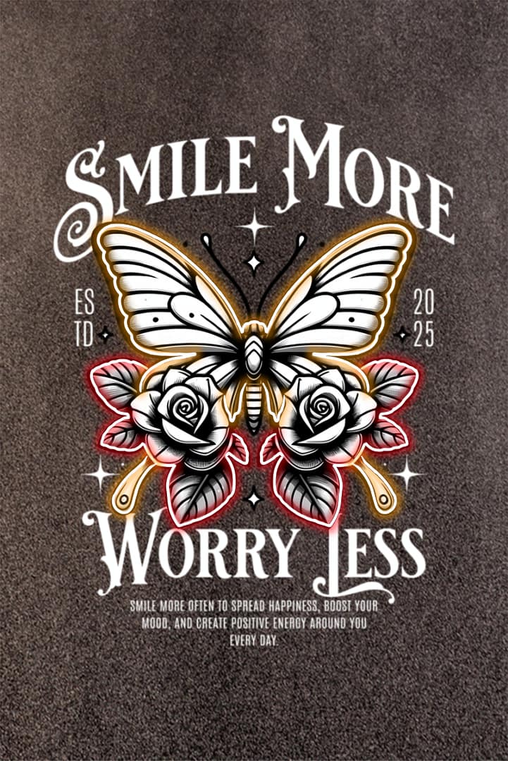 Ett inspirerande motiv som förenar skönhet och styrka: en detaljrik fjäril med två dramatiska rosor som vingar. Orden “Smile More – Worry Less” i bakgrunden ger designen en kraftfull budskap – att sprida positivitet och släppa oro. Denna unika design är perfekt för den som lever med ett öppet hjärta och ett starkt sinne.