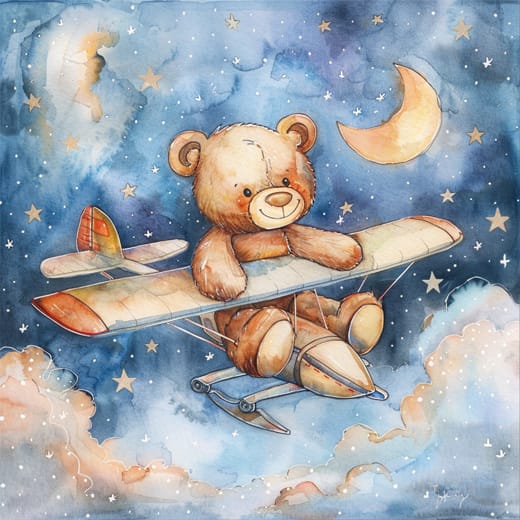 En söt björn svävar genom natthimlen på ett vintageflygplan, omgiven av stjärnor, moln och en skimrande måne. Med neonljus som ramar in kroppen lyser björnen upp mörkret och förvandlar flygturen till en magisk drömresa bland stjärnorna.
