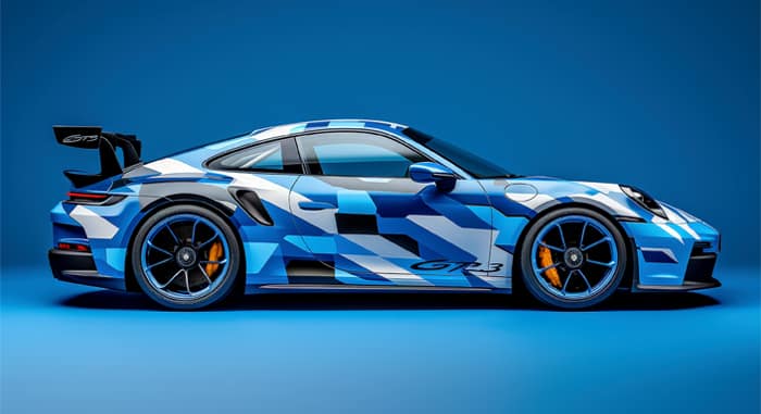 En Porsche GT3 svept i blå kamouflage står som en digital vision i hyperverklighet. Varje linje pulserar – inramad av ett elektriskt sken som förvandlar karossen till en ljussiluett.