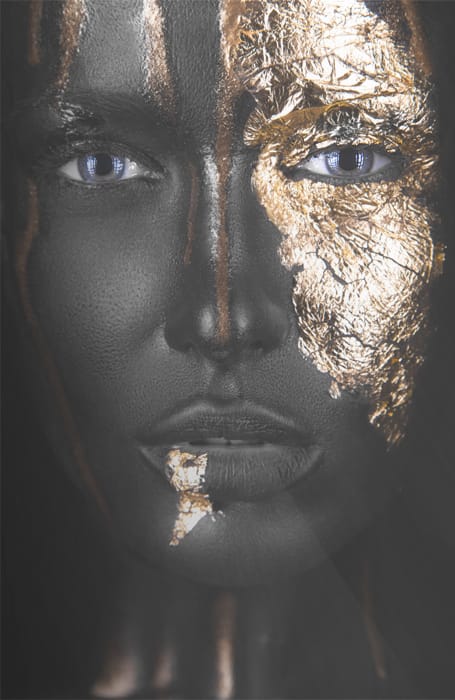 Detta slående digitala konstverk fångar essensen av skönhet och kontrast och blandar inslag av guld och neon med ett monokromt porträtt.