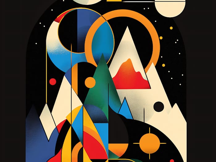 abstrakt tavla, geometrisk väggkonst, modern poster, färgstark konst, kosmiska former, stiliserade berg, cirklar och trianglar, futuristisk inredning, grafisk konst, konst med djup, statement piece, kreativ väggdekor, modern abstraktion.