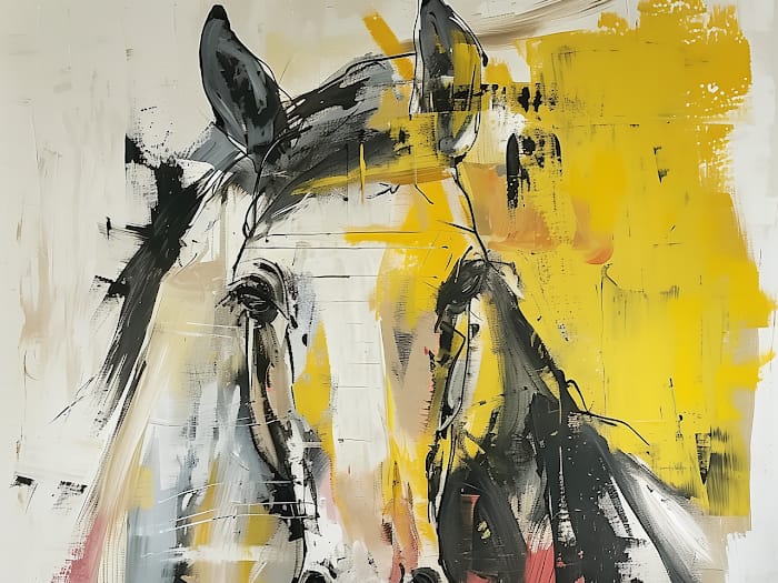 Neon Tavla med ett abstrakt hästporträtt – kraftfulla linjer, uttrycksfulla former och en intensiv gul bakgrund för en energifylld väggdekor.
