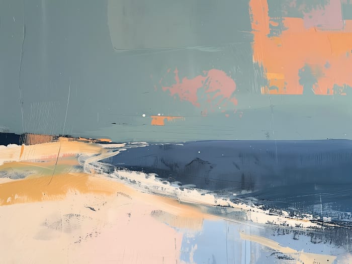 Denna abstrakta landskapsmålning tolkar ett möte mellan hav och land med modern känsla. En mjuk, krusande våg slår in mot en varm sandstrand under en stilla, blågrön himmel. Persikotoner och ljusa färgfläckar bryter upp kompositionen och skapar en visuell rytm.
