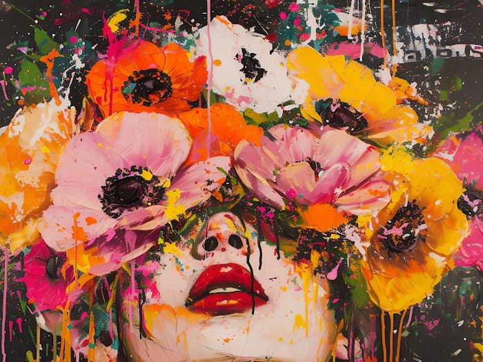 Neon Tavla Blomsteransikte är ett vibrerande konstverk som förmedlar både styrka och mystik. Den rödmålade munnen kontrasterar skarpt mot de färgglada blomster som täcker ögonen, vilket skapar en suggestiv känsla av både skönhet och anonymitet. De livliga färgstänken och de kraftfulla penseldragen förhöjer uttrycket och ger tavlan en känsla av rörelse och spontanitet.