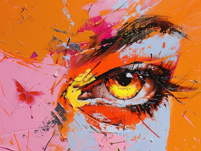 Neon Tavla Brinnande Blick är ett kraftfullt konstverk som fångar betraktarens uppmärksamhet direkt. Den detaljrika återgivningen av ett öga, omgivet av explosiva färger i orange, gul och rosa, ger ett intryck av eld, styrka och känsla. Det intensiva uttrycket och den abstrakta bakgrunden förhöjer dramatiken och lämnar stort utrymme för tolkning.