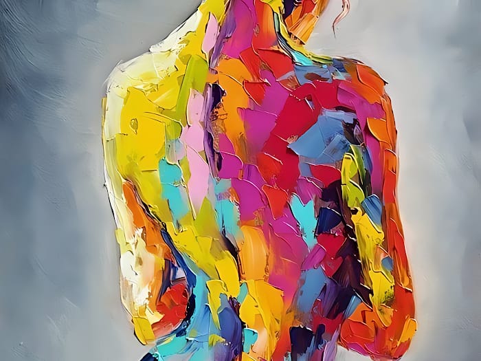 Neon Tavla Expressionistisk Ryggporträtt är ett kraftfullt konstverk som fångar blicken direkt. Med en kvinnlig rygg som motiv, målad med tjocka impastopenseldrag i starka färger som gul, röd, blå, rosa och lila, förmedlar målningen energi, känsla och rörelse. Den abstrakta uppbyggnaden och intensiva färgpaletten ger verket ett starkt uttryck, samtidigt som det lämnar utrymme för tolkning.