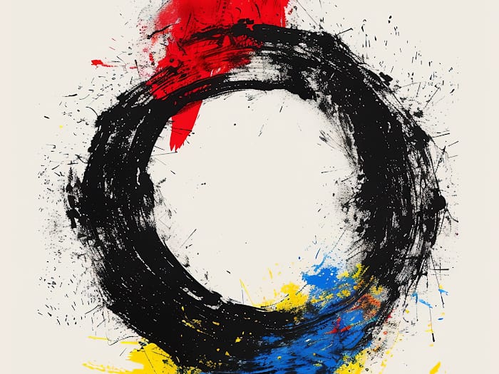 zen tavla, modern ensō, abstrakt cirkelkonst, färgstark väggkonst, japansk minimalism, konst med balans, modern expressionism, svart bläck konst, röd blå gul tavla, meditation konst, abstrakt symbolik, konst för kreativa rum, zen inspiration, energi i konst, japansk kalligrafi modern