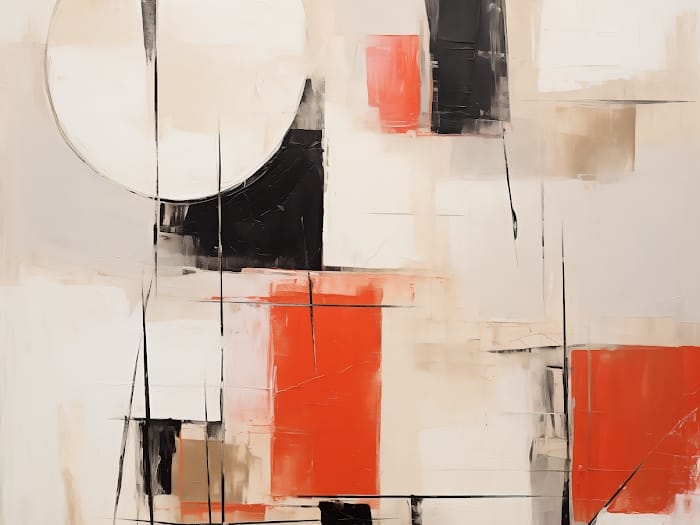 Neon Tavla Geometrisk Abstrakt Konst är ett slående modernt konstverk som leker med form, kontrast och komposition. Med rena linjer, texturerade penseldrag och en genomtänkt balans av färgblock i rött, svart, beige och vitt, tillför denna målning struktur och värme till alla typer av inredning.