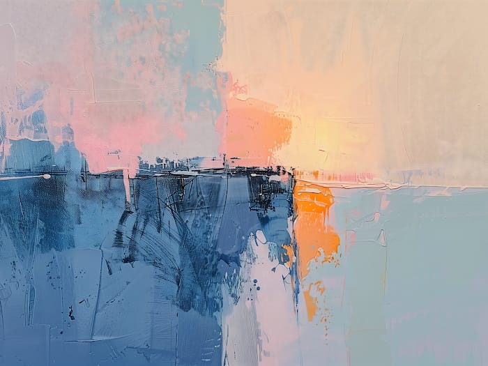 Med palettknivens svep och mjuka färgövergångar, skapas en känsla av rymd, reflektion och tidlöshet. Färgpaletten rör sig mellan svala blåtoner och mjuka pasteller, med en varm kärna av solgult och persikofärgat ljus som tycks pulsera från duken.