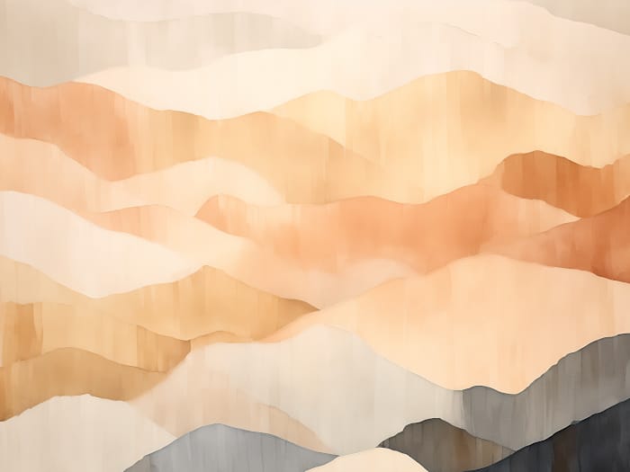 Neon Tavla med ett harmoniskt, abstrakt landskap – lager av mjuka bergsformer i varma beige, terrakotta och grå nyanser för en lugn och balanserad väggdekor.