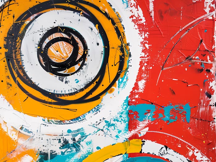 neon tavla, abstrakt konst, modern väggkonst, färgstark målning, cirkelmotiv, urban konst, röd gul turkos konst, konst med puls, dynamisk väggdekor, konst med energi, statement piece, färgexplosion, kreativ inredning, expressiv målning, industriell konststil