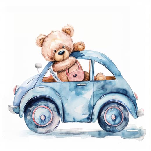 Bilen är målad i mjuka akvarelltoner av denimblått, med röda och vita detaljer på hjulen. Nallen har varma beigefärgade toner och rosiga kinder, och håller i en glad liten väska. Det gröna neonglänset runt bilen skapar en slående kontrast mot de mjuka färgerna – en härlig blandning av charm och modern känsla.