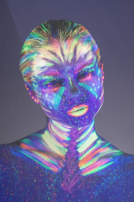 En fascinerande konstnärlig representation av neon UV-glöd i ett futuristiskt och kosmiskt tema. Den lysande ansiktsmålningen i neonfärger skapar en hypnotisk effekt, perfekt för alla som älskar modern, elektrisk och färgsprakande konst. Ett perfekt tillskott till neonälskande interiörer eller för dem som uppskattar unika, avantgardistiska uttryck.