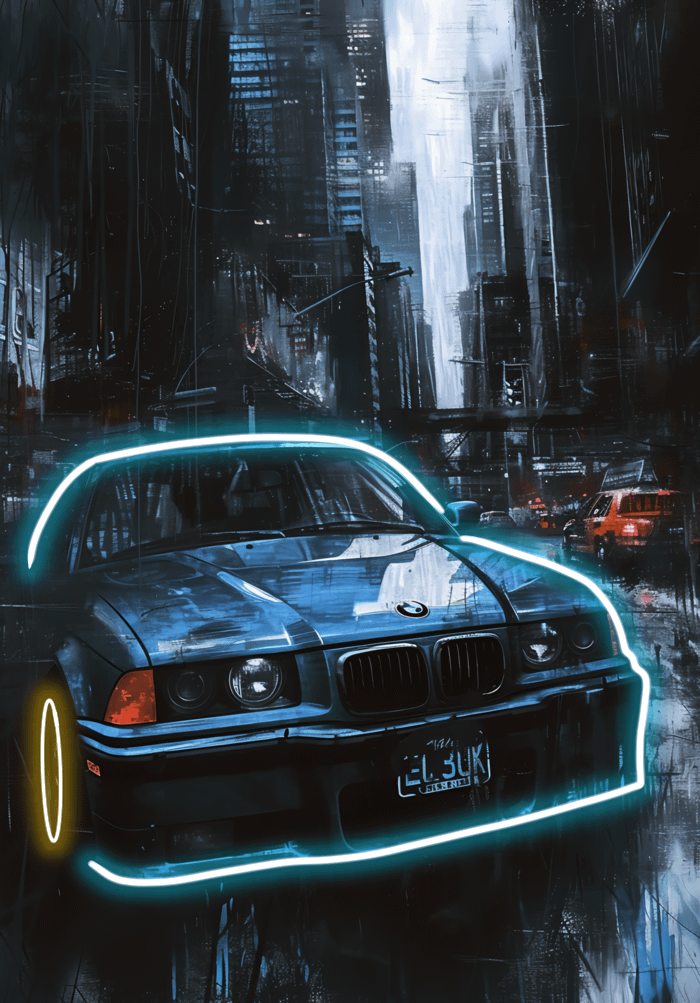 Den blanka blå lacken sticker ut mot den mörka urbana bakgrunden och förstärks av reflektioner i rosa, gult och grönt. Varje element tillför rörelse och kontrast, medan bilens rena linjer förblir skarpa och definierade – som en scen hämtad från en grafisk roman.