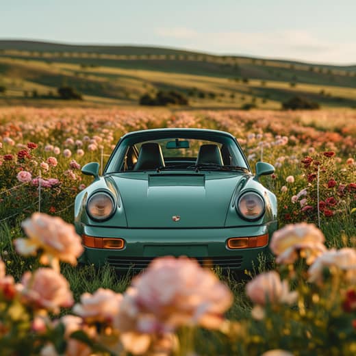 Porschens släta turkosa lack framhävs av en lysande neongrön kontur som följer dess kurvor. Bilens ljusblå strålkastare glöder mjukt, medan fältets rosa, röda och gröna toner skapar en levande kontrast som får bilen att framträda som en juvel bland blommorna.