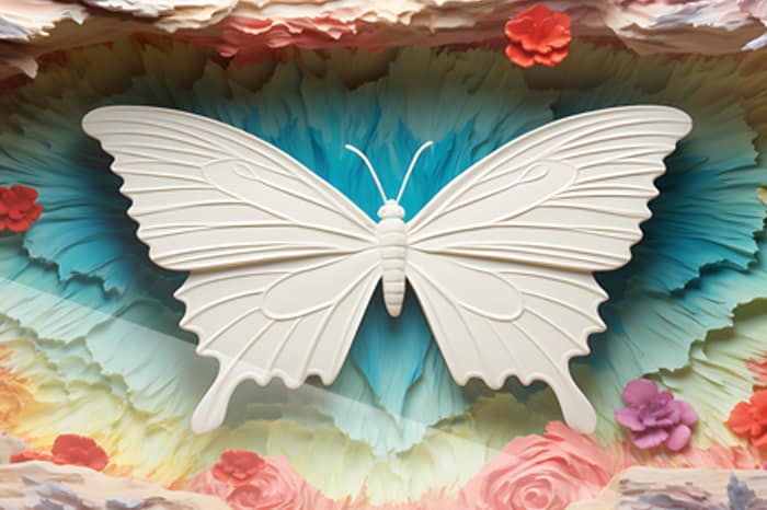 Denna konstnärliga tavla visar en elegant fjäril med en slående vit design, placerad mot en färgsprakande bakgrund fylld med texturerade blommor och organiska former. Fjärilen har en mjuk, detaljerad struktur som lyfts fram av en lysande neonlinje i gult, vilket skapar en modern och futuristisk effekt.
