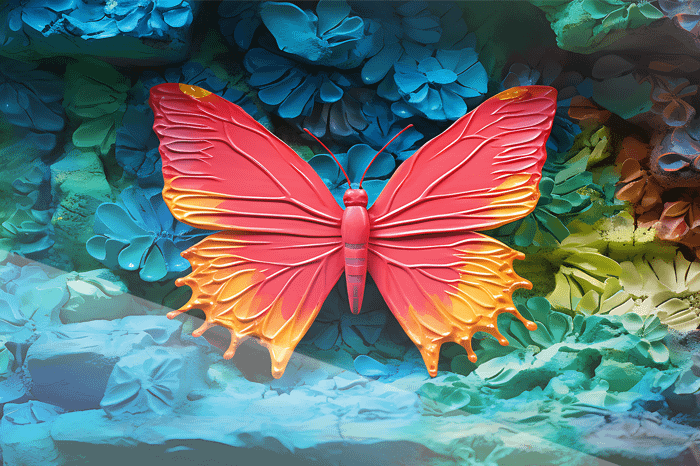 Lysande neonkanter förstärker fjärilens konturer och skapar en levande 3D-effekt.