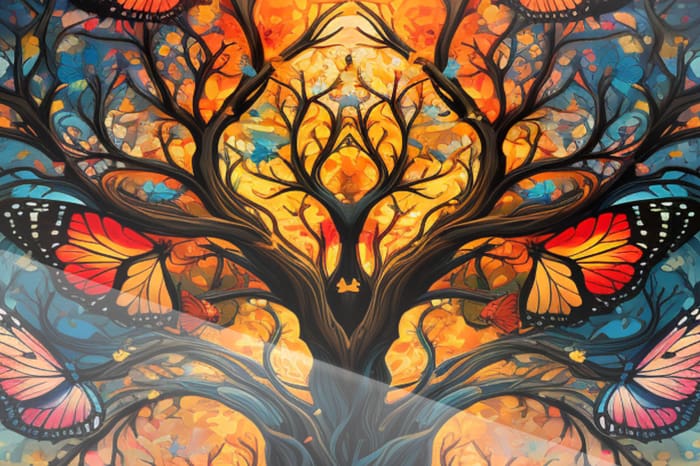 Ett spektakulärt konstverk där neonupplysta fjärilar svävar runt ett mystiskt träd, vars grenar formar ett ansikte i lågornas sken. En fusion av natur och surrealism som fångar både livets skörhet och dess kraft.