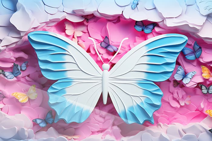 En majestätisk fjäril med en lysande gul neonkant svävar graciöst mot en mjuk, blomsterinspirerad bakgrund i rosa och blå toner. Dess detaljrika vingar skapar en illusion av rörelse och liv, medan de omgivande fjärilarna förstärker känslan av en magisk och drömsk värld.