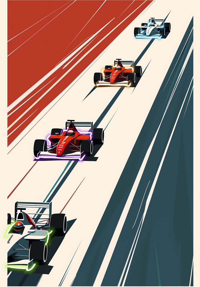En svärm av Formel 1-bilar dundrar nerför raksträckan, var och en glödande med sin egen elektriska identitet. Hastighet och symmetri dominerar bilden – en balett av fart återgiven i skarpa linjer och rå energi. Här möts konst och apex, där varje maskin berättar en historia om design, aggressivitet och total fokus.