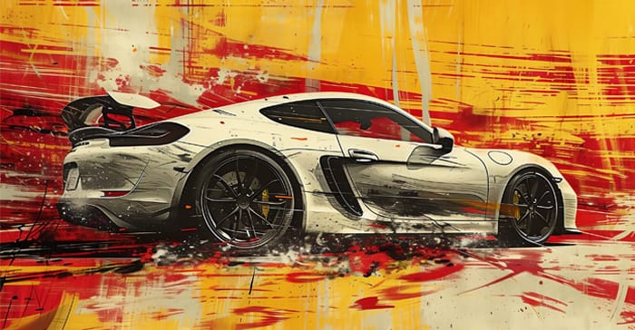 En silvrig sportbil rusar genom ett abstrakt inferno av eldiga färger och vild rörelse. Den gröna neonkonturen lyfter varje kurva i karossen medan blå hjulringar glöder som plasmaskenor. Ett kraftfullt konstverk där fart möter hetta i futuristisk perfektion.