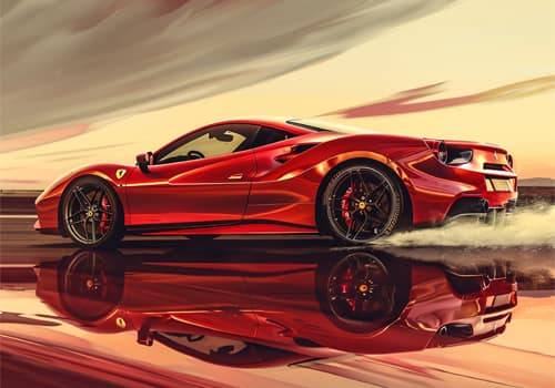 En kraftfull röd Ferrari sveper fram genom en futuristisk solnedgång, där varje linje förstärks av neonens sken. Ett konstverk som fångar farten, stilen och energin i en elektrifierad värld.