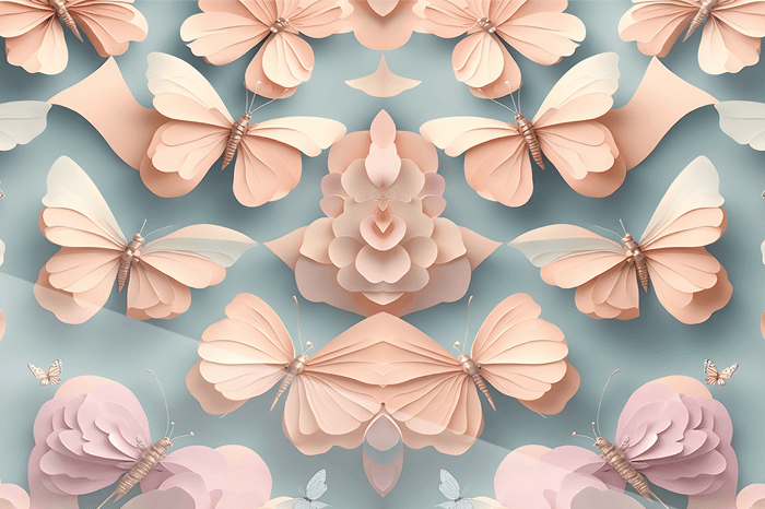 Ett hypnotiskt mönster där fjärilar dansar i perfekt symmetri över en himmelsblå bakgrund. I centrum framträder ett par sammankopplade fjärilar med neongula konturer – en lysande symbol för samhörighet och balans. Varje vingslag bär på en viskning om skönhetens eviga rörelse i naturens geometri.