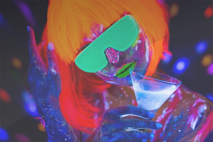 Upplev den ultimata futuristiska partystämningen med detta levande konstverk. Bilden visar en person i en lysande orange peruk och neonfärgade glasögon, vilket skapar en djärv och modern look. Ansiktet och kroppen är täckta med fluorescerande färger i blått, rosa och grönt som lyser upp i UV-ljus och ger en elektrisk känsla av energi och rörelse. Personen håller en martini i handen, vilket förstärker den avslappnade men ändå livliga atmosfären.
