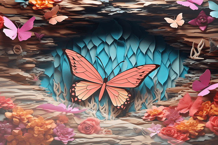 En elegant orange fjäril med svarta och vita detaljer vilar mitt i en färgstark skogsscen. Omgiven av rosa, röda och orange blommor samt fjärilar, framträder fjärilen starkt tack vare sin klara blå neonkontur. Bakgrunden består av blågröna bladformade mönster, vilket skapar djup och en nästan magisk känsla.