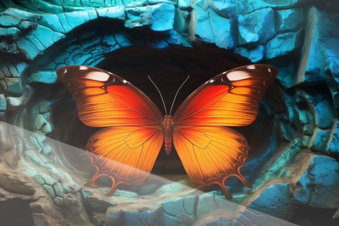 Denna kraftfulla väggkonst presenterar en levande orange fjäril med inslag av rött och svart, omgiven av klarlila neonljus. Den är placerad framför en dramatisk bakgrund av turkosa, spruckna stenar som skapar en känsla av djup och mystik. En perfekt kontrast mellan fjärilens livfullhet och den råa, texturerade ytan bakom – ett fängslande konstverk för ett modernt och djärvt hem.
