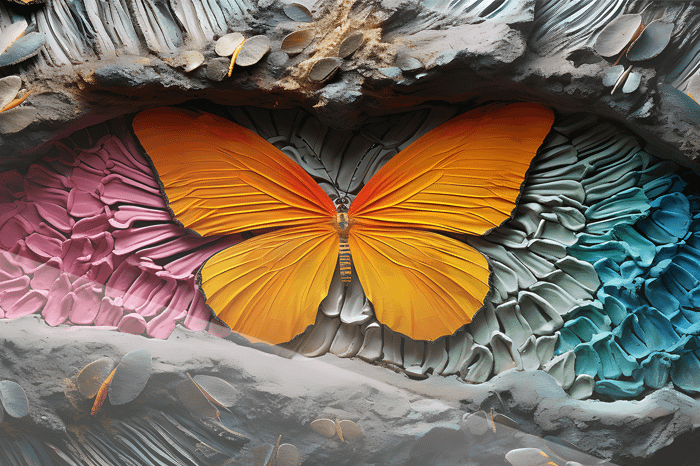 Denna kraftfulla väggkonst visar en livfull orange fjäril upplyst med intensivt röd neon, svävande över en rik, texturerad bakgrund i nyanser av rosa, turkos, blått och grått. Fjärilens eleganta linjer och det glödande ljuset skapar ett dramatiskt och färgstarkt fokus, perfekt för att ge karaktär åt vilket rum som helst.
