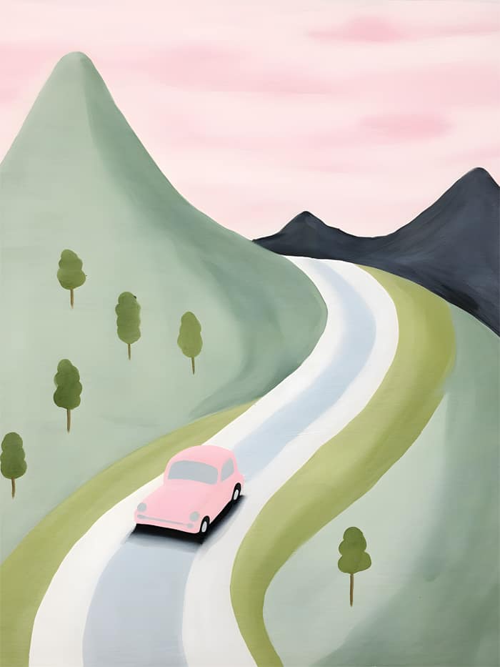 En liten rosa bil rullar sakta fram längs en slingrande väg mellan gröna kullar och mystiska berg. Den pastellrosa himlen ger scenen ett mjukt, nästan drömskt sken – som om hela landskapet vilar i ett stilla ögonblick. Perfekt för barnrum, lekrum eller som en stilfull detalj i ett nordiskt inspirerat hem.