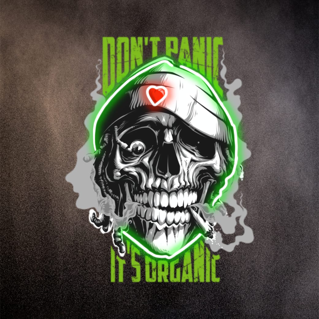 rökdödskalle konst, avslappnad rebell design, neon chill vibe, ekologisk streetwear, grönt är skönt konst, don’t panic stil, rökig dödskalle poster, urban zen estetik, alternativ avslappning, street chill skull