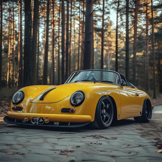 En ikonisk Porsche 356 Speedster, i ett bländande gult skal och insvept i varm neon, står självsäkert på en stenlagd stig mitt i skogen. Ett möte mellan retroklass och futuristisk stil – här möts 50-talets elegans och morgondagens ljus.