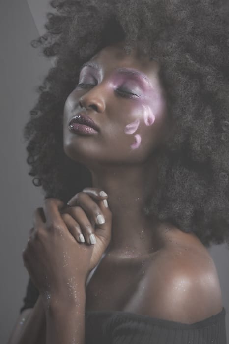 Hennes drag glöder under den subtila neonkonturen som framhäver hennes voluminösa lockar.