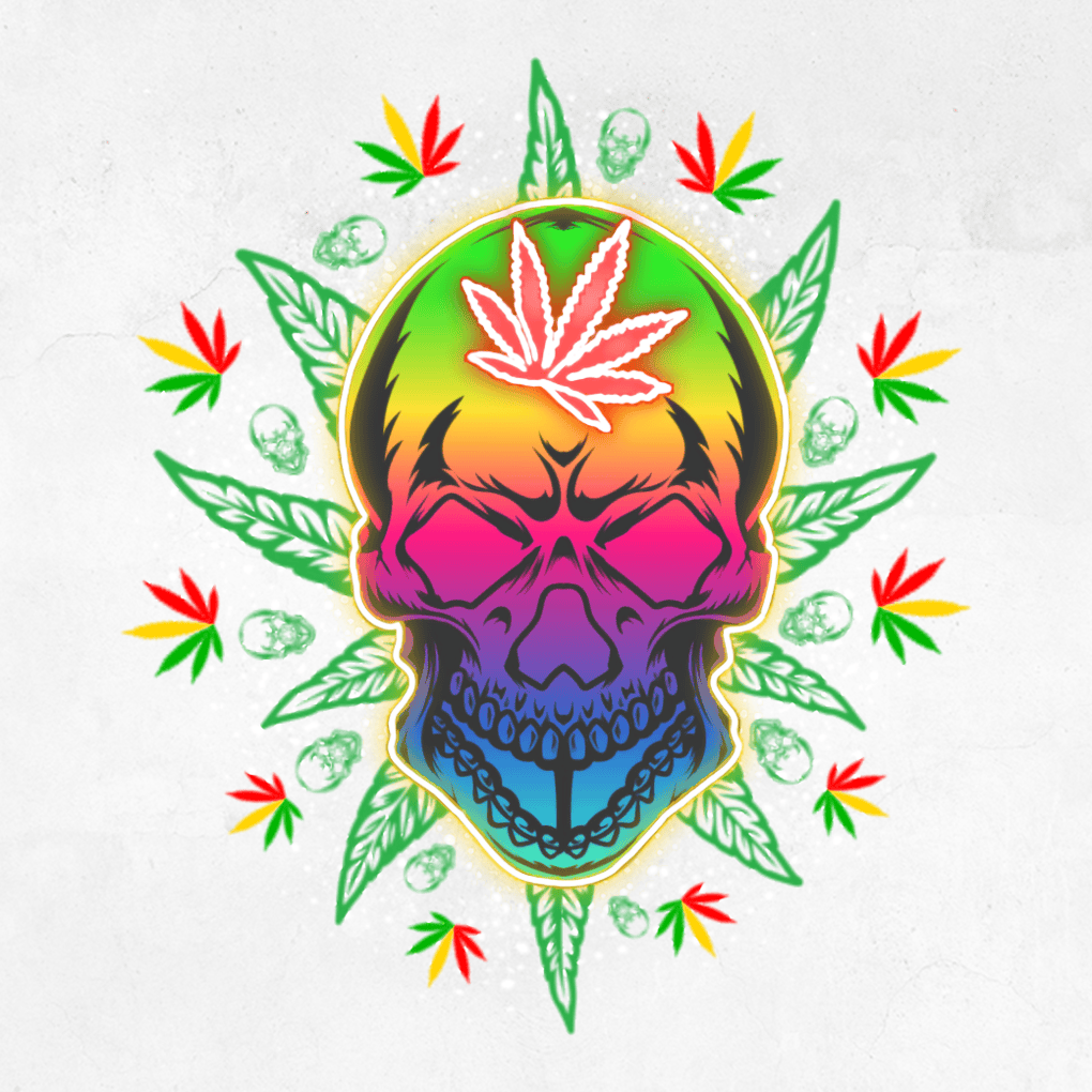 En vibrerande dödskalle i färggradient från eldigt gult till isigt blått, prydd med ett ensamt cannabisblad mitt på pannan. Omgiven av en gloria av flerfärgade marihuanablad och subtila små dödskallar, skapar designen en spirituell och rebellisk aura – som en psykedelisk helgonikon för stoner-kulturen.