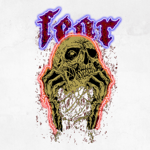 Ett skelett sliter av sitt eget ansikte som om sanningen ligger bakom huden. Ögonen gapar tomma, händerna darrar av kraft – men det som lyser är modet att möta mörkret. Ordet Fear brinner ovanför i ett neonflimmer som vägrar viska.