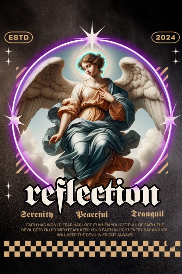 Ett vackert och stämningsfullt konstverk som visar en ängel med stora, vita vingar sittandes på ett moln. Ängeln har en mild och kontemplativ blick, med händerna placerade över bröstet. Runt ängelns huvud finns en ljus halo med en subtil grön ton, och hela figuren omges av en mjuk, lila neonliknande aura. Ovanför ängeln står “ESTD” och “2024” på varsin sida. Under ängeln står ordet “reflection” i ett elegant, gotiskt typsnitt med en ljus kontur. Under det syns orden “Serenity”, “Peaceful” och “Tranquil” separerade av stjärnor. Längst ner finns en text om tro och att övervinna rädsla. Konstverket har en slät och glansig epoxibeläggning som förstärker ljuset och färgerna och ger en skyddande yta.